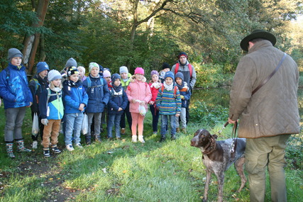 Bei strahlendem Sonnenschein machten wir uns auf den Weg in Richtung Sempelsteich, um einen spannenden Tag in der Natur zu verbringen. Am Ziel angekommen, wurden wir herzlich von Herrn Gebel und seinem Jagdhund Emma empfangen. Herr Gebel erklärte uns die vielfältigen Aufgaben eines Jägers und erläuterte die Bedeutung der Hunde bei der Jagd. Besonders beeindruckend war die Vorführung, bei der Emma auf Kommando eine Gummi-Ente aus dem Wasser holen musste.